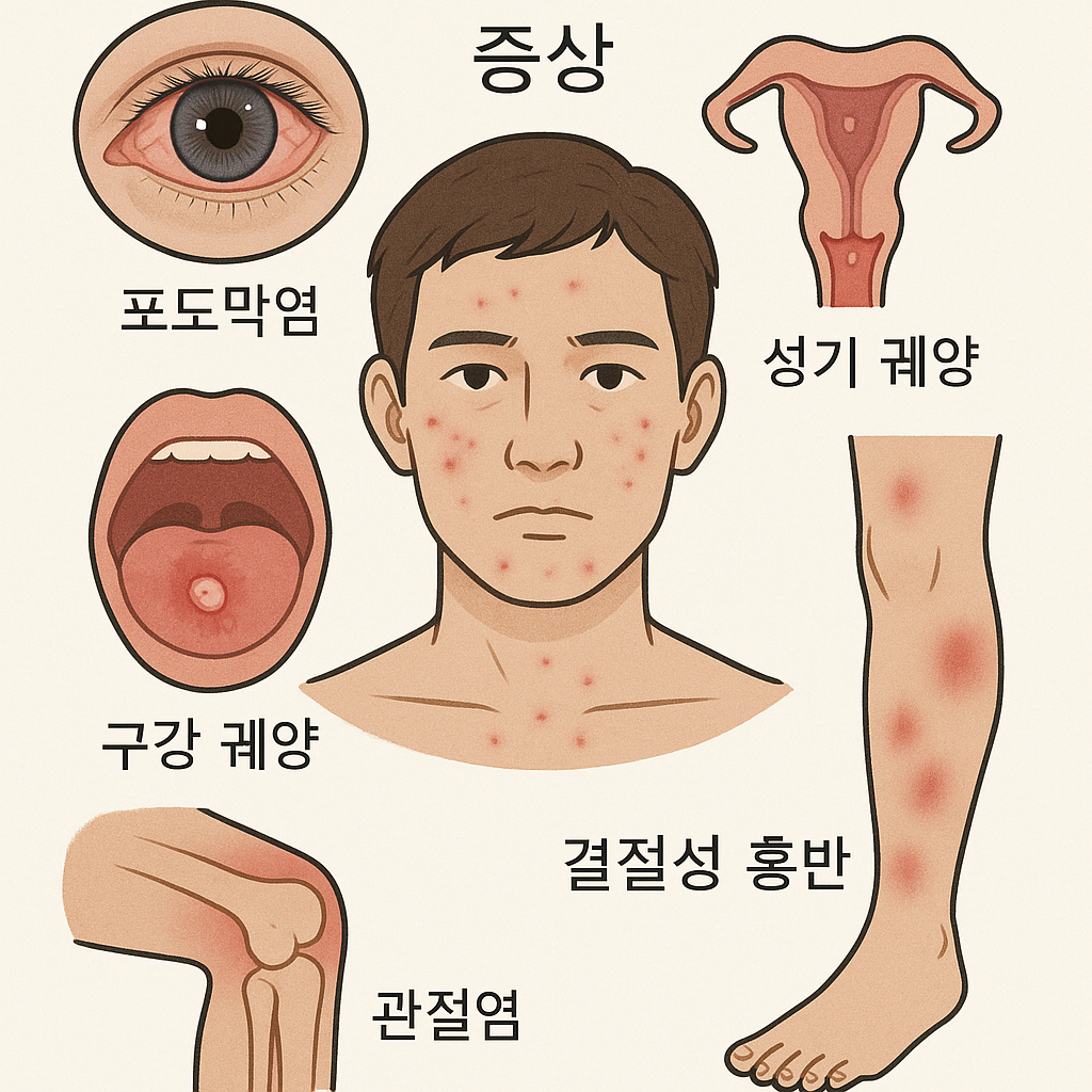 | 주요 증상 | 구강/생식기 궤양, 눈/피부 염증, 관절통 등 |